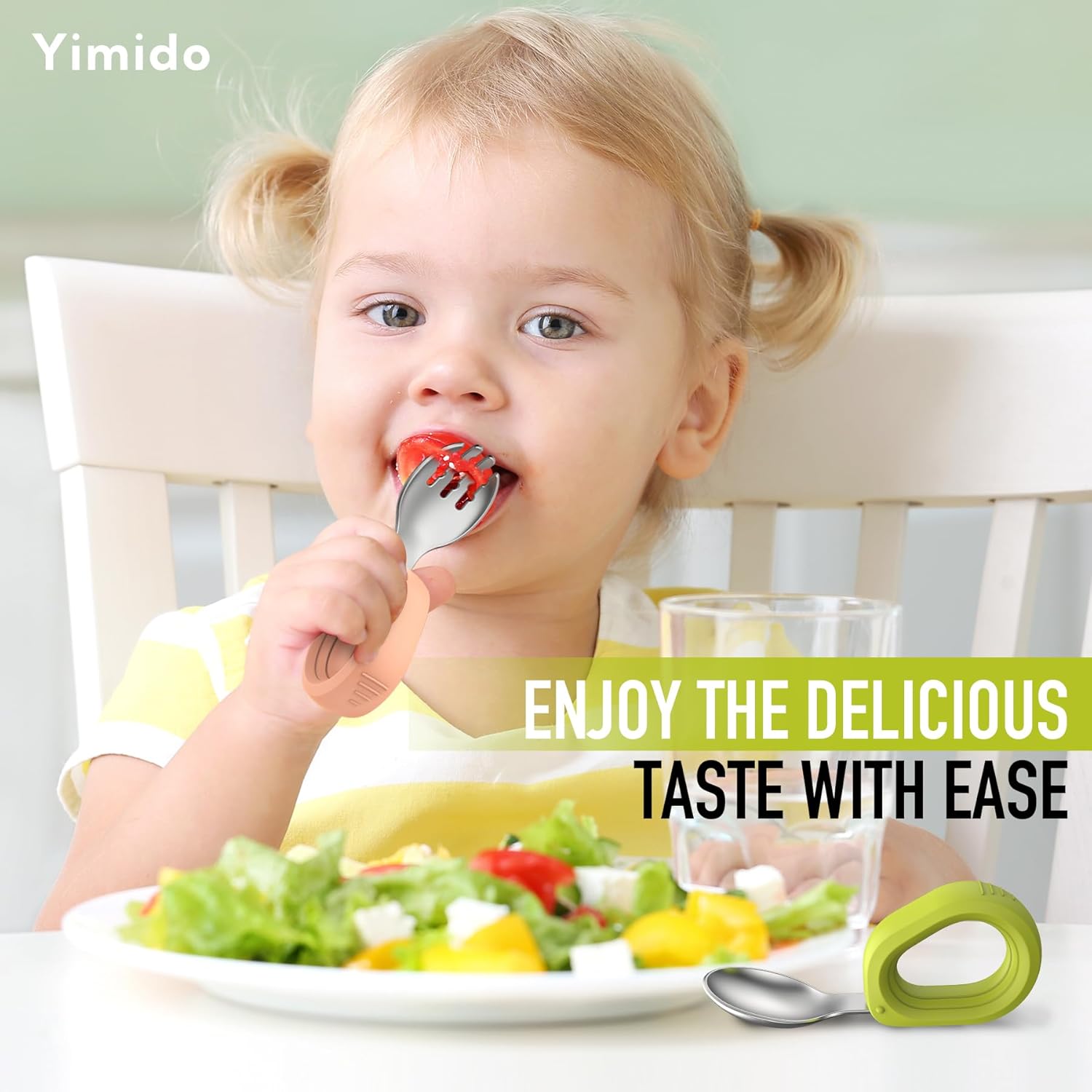 - [Good Materials that Parents Want] The whole body of the toddler fork and spoon is made of high-quality stainless steel and silicone. The heads of stainless steel forks and spoons are strong and resistant to wear and tear. Silicone handle, flexible and elastic to hold, not easy to slip, not afraid of biting.