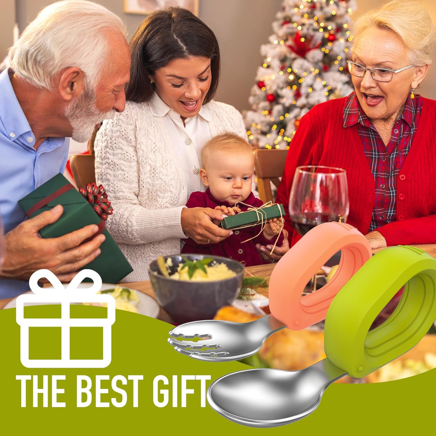 - [Hollow handle design for stable grip] The baby Utensil has a hollow ring handle that fits where a baby makes a fist. It's made of flexible food-grade silicone that's safe to chew, and when eating, baby can grab the soft handle with one hand or put a finger into the loop, making it easy for baby to eat.