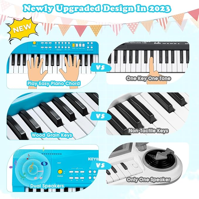 - 【Learning Essential Music Theory】The 37 key toy piano keyboard for kids will help your children learn beats or other music theories and the piano is equipped with a small microphone, kids can sing while playing. Learning to develop other performance abilities and cognitive skills while playing the electric piano keyboard toy is a win-win. Perfect for 3 4 5 6 7 8 year old boys, girls, beginners and starters to learning practice/studio, home theater living room performances.