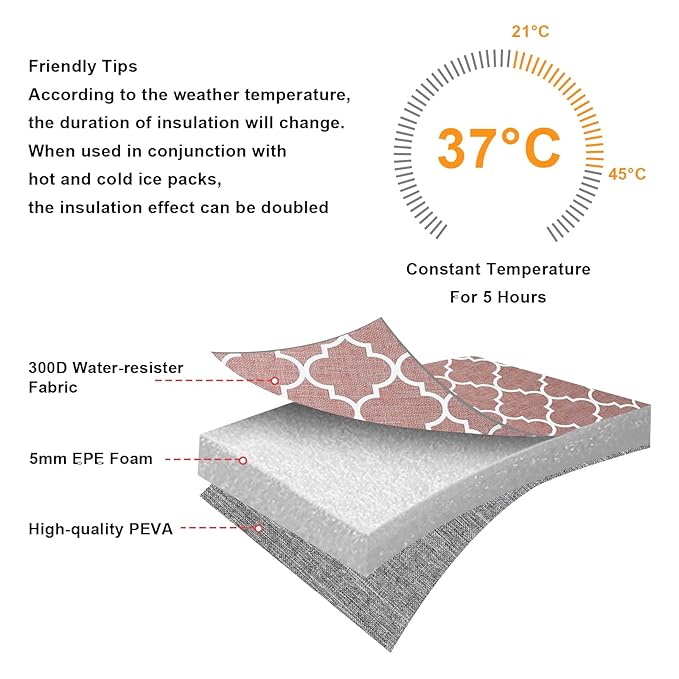 • WATERPROOF & LEAKPROOF: Waterproof fabric is used inside and outside the bag. It is easy to clean the inner, just wipe it off with cloth or paper towel if liquid spills. Composite oxford fabric is resistant to water, dirty and abrasion, protecting items inside. The internal mesh pocket can be used to place ice bags, pacifiers and other small items.