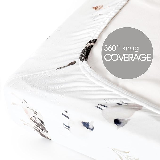 Stretchy Ultra Soft Jersey Knit Pack and Play Sheets Set 3 Pack, Portable/Mini Crib Sheets for Boys and Girls, Universal Fit for Pack N Plays Safe and Snug, Cute Watercolor Cows and Birds Print