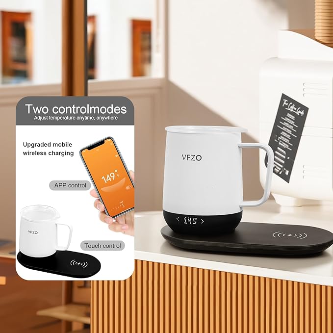 - Skilfully crafted: Elegant ceramic matte finish covers the durable stainless steel body of the mug. Comfortable to hold at only 16 oz, ergonomically designed body and handle fits perfectly in your hand. This self-heating coffee mug has two temperature control methods to choose from. You can set the temperature directly via the touch button on the smart coffee mug and VFZO APP on your phone. Comfortable and fast, you can drink hot coffee anytime, anywhere.