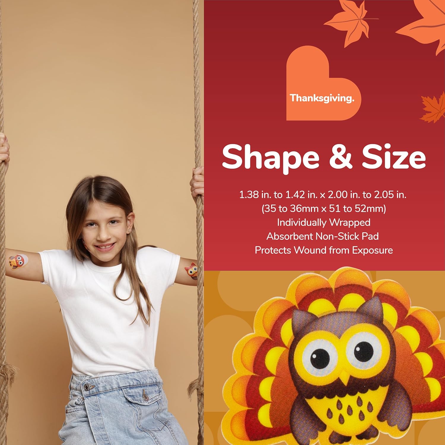 - SAFE PACKAGING: These sterile Thanksgiving cartoon character bandages come in cute and adorable packaging, and are individually wrapped for safe handling; small bandages help protect kids' sensitive wounds from coming into contact with dirt for first aid wound care