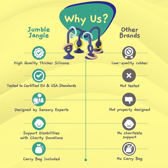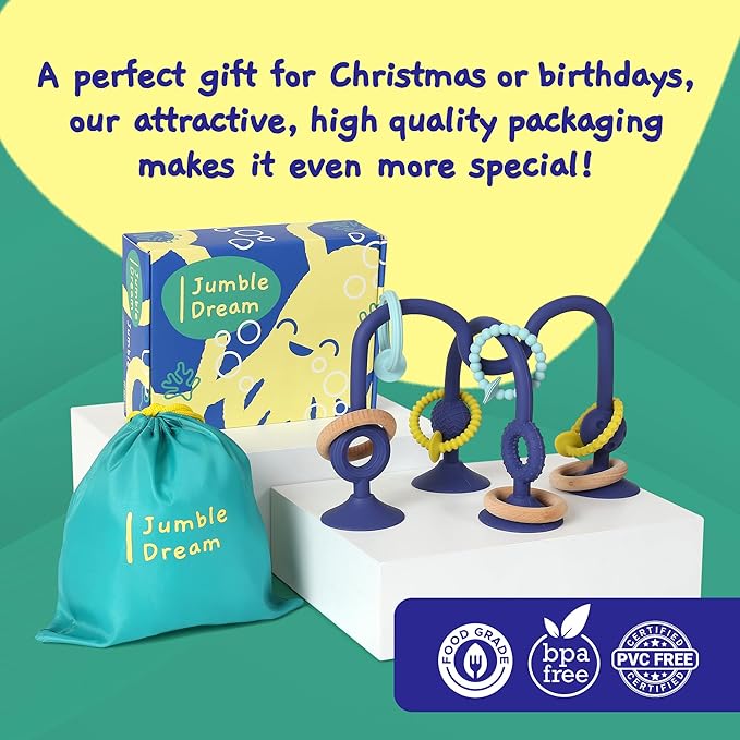- 🌟 Sensory Teething Relief with Suction Magic: Join our Jumbling journey of sensory play and soothing baby teething relief with our high chair toy. Giving babies and toddlers the freedom to explore at their own pace, encouraging curious little minds to discover new textures and shapes.