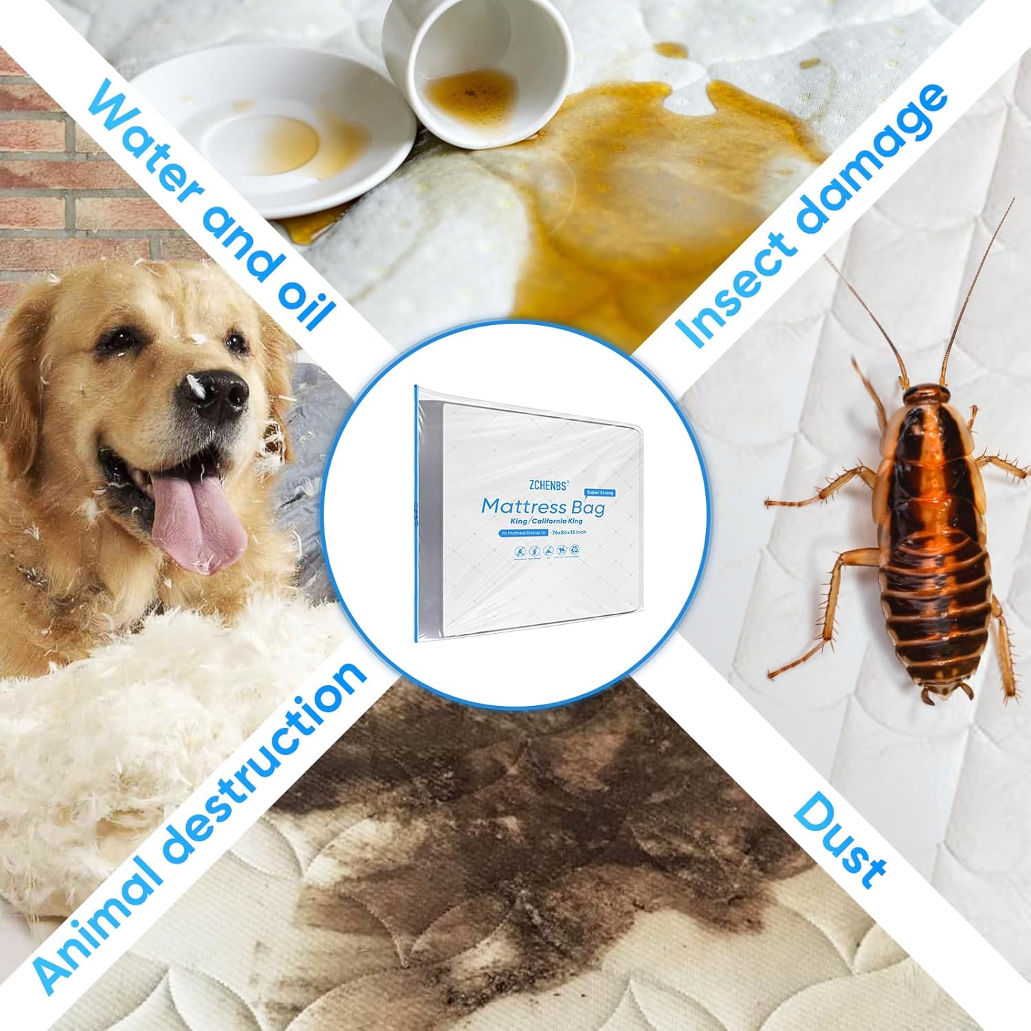ZCHENBS® – Mattress Bags for Moving and Storage,Mattress Bag with Zippers,5 Mil Ultra-Thick Bed Bag,Waterproof,Anti-Tear,Heavy-Duty Mattress Bag (Transaparent/Blue, King/California King-(1 Pack)