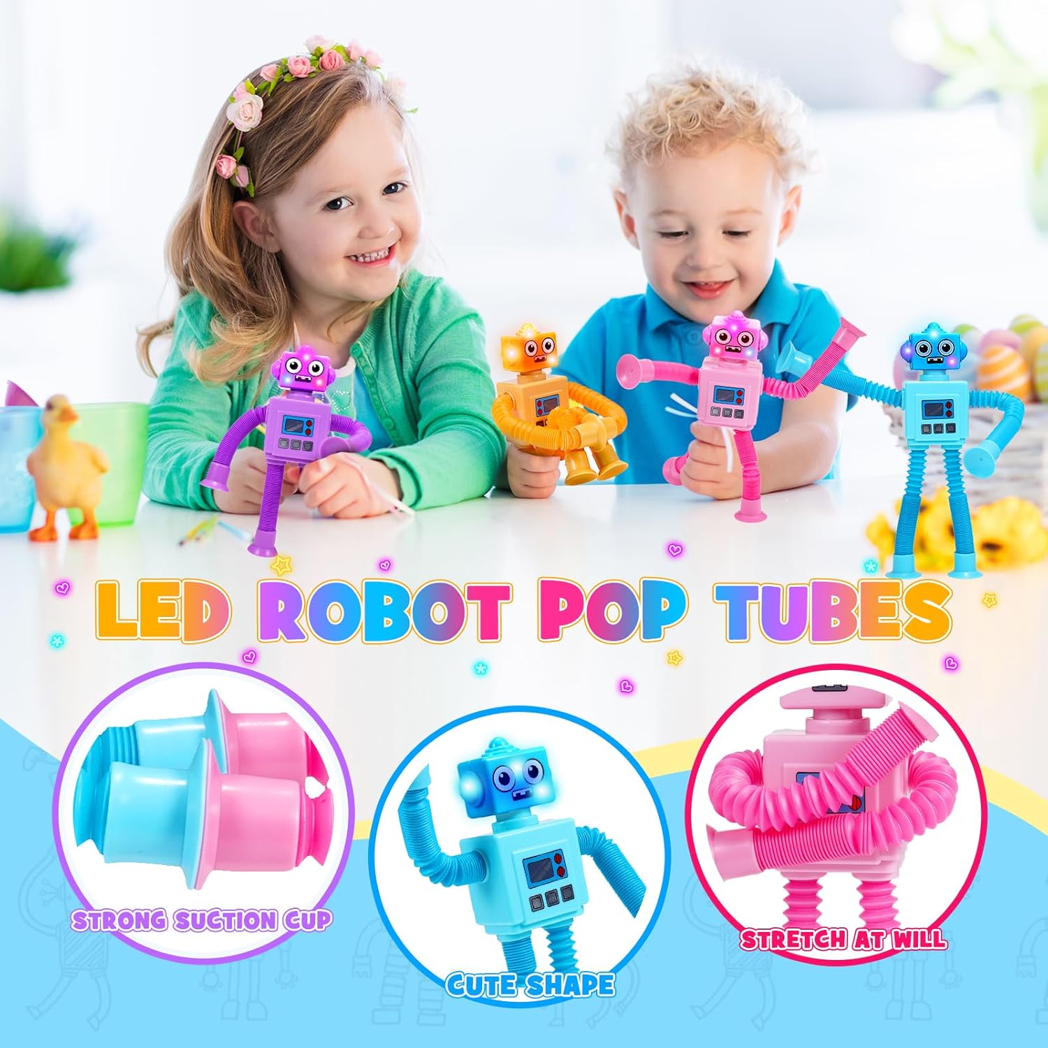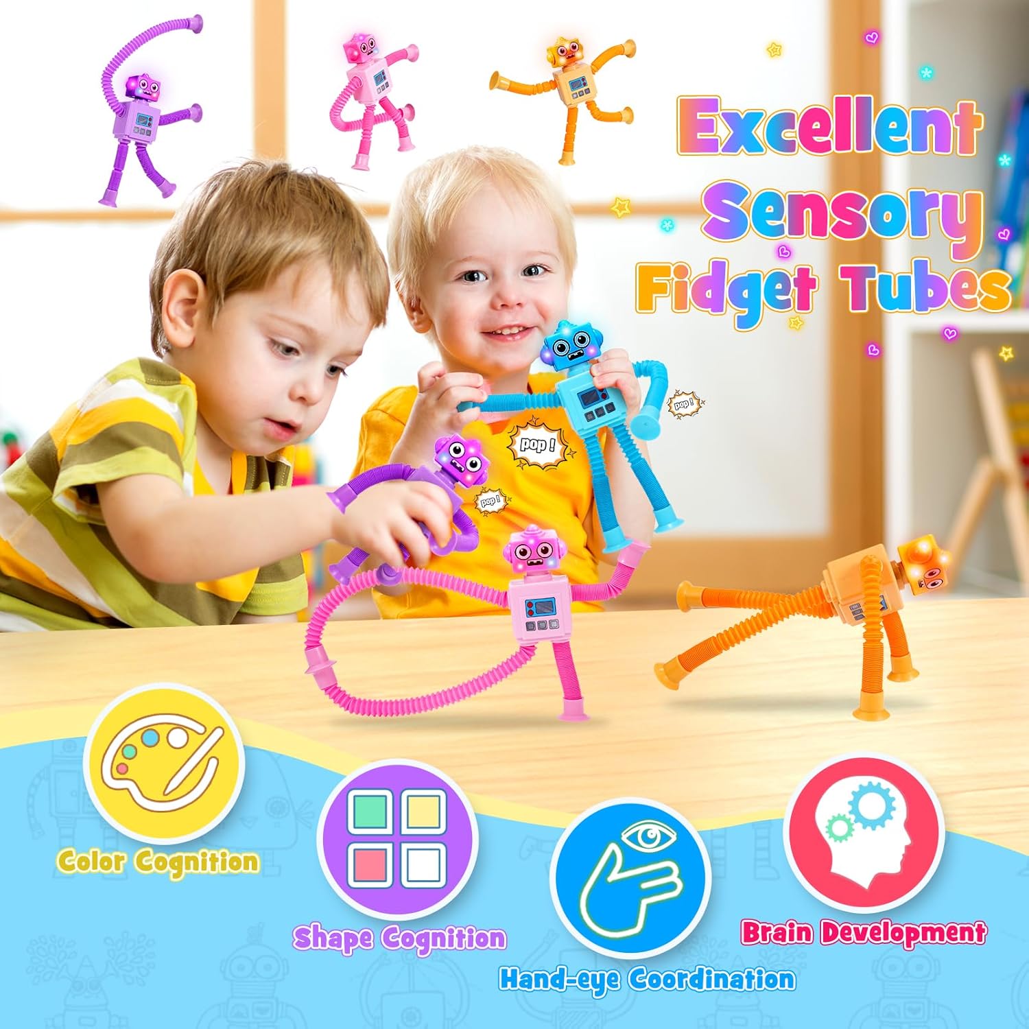 Robot Fidget Toys for Kids : 4 Pack LED Robotic Pop Tubes Telescopic Suction Cup Sensory Toy for 2 3 4 5 6 7 8 Year Old Boys Girls Christmas Birthday Gifts for Kid Ages 2-4 Toddler Travel Toy
