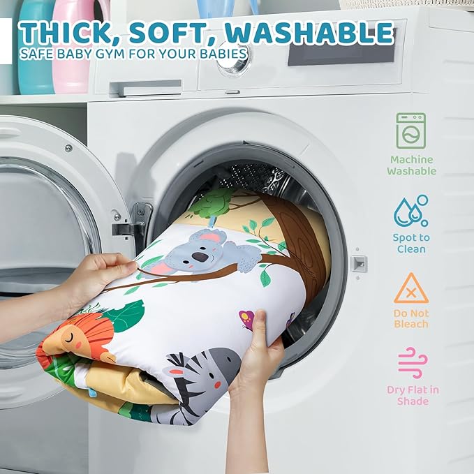 - Soft, Safe, and Washable - The baby gym play mat is made from high-quality fabrics, thick, delicate, and smooth touch, safe and comfortable for baby skins. Machine washable, easy to clean and keep hygienic. The tummy time activity mat can also be used directly on the floor, providing cushioning and protection for the baby. The balance of flatness and softness makes it more stable for babies to sit, stand and crawl.