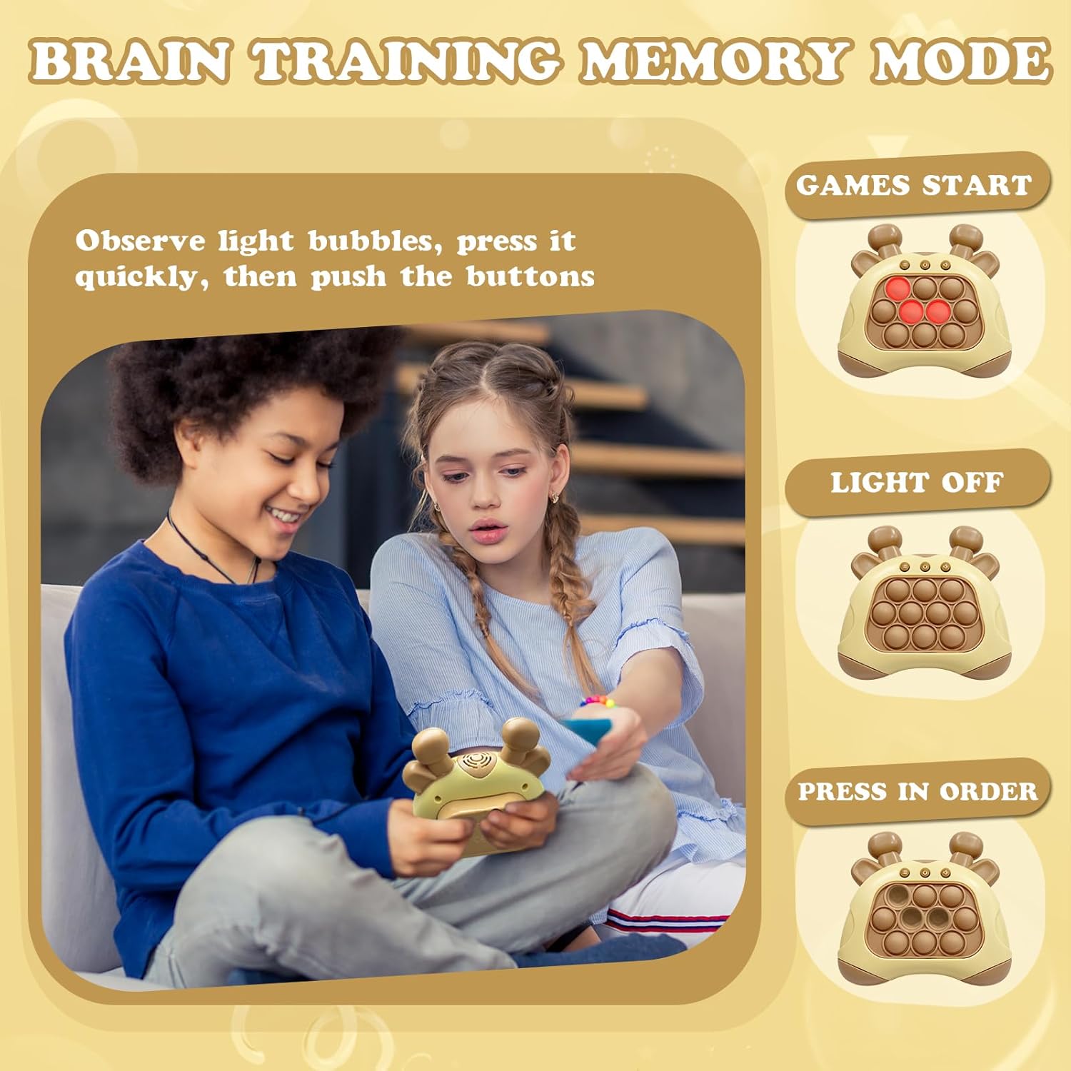 - 🎮【Upgraded Quick Push Pop Game】-- If you are looking for an entertaining way to pass times for kids, check out our pop pro light up games. Compare to addictive classic press bubble game handheld, our fast push bubble games make kids engaged in positive thinking, hand-eye coordination, and brain training during playing challenges filled with lights and sounds, promoting kid’s sensory development, improving reaction ability, memory, and logical thinking skills in a fun way.