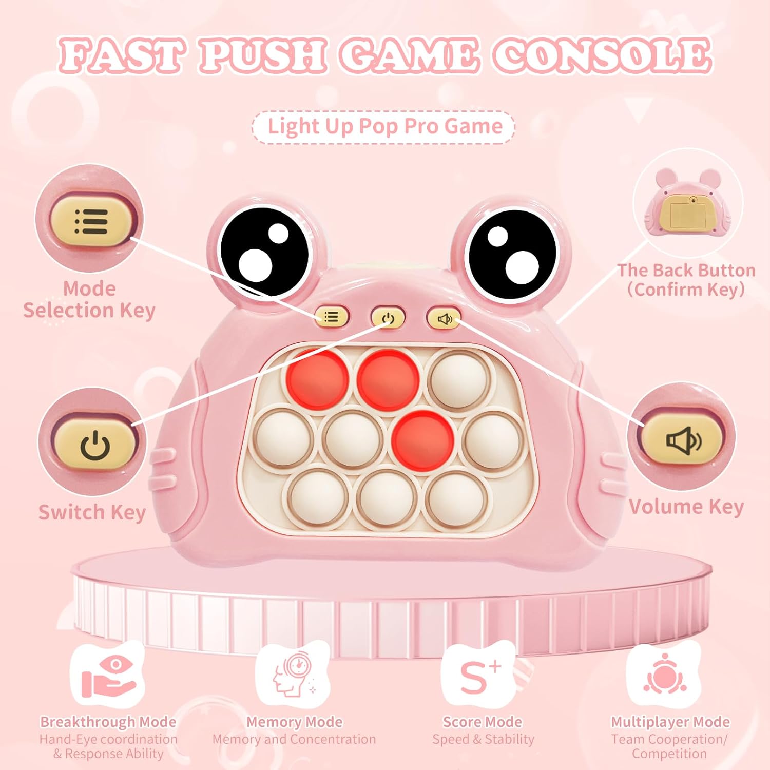 - 🎮【Breakthrough Multi-mode Design】-- Pop pro light up game with four modes, includes single-player challenges and multiplayer showdowns. Customs Clearance Mode & Memory Mode: Remember randomly lit bubbles and press bubbles quickly, correctly to pass each level; if you press wrong, Game over. Scoring mode: Turn off as many lights as possible within one minutes; Multiplayer mode: each player takes turns completing a level before passing the machine on to the next player.