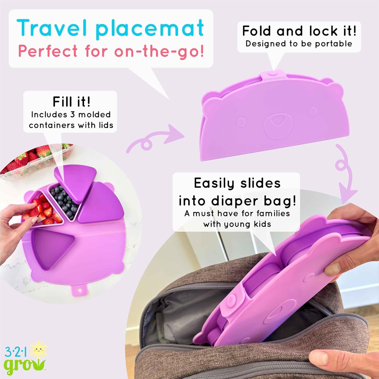 - TRAVEL FRIENDLY DESIGN: Snack Mat folds and locks, making it convenient for snacking or eating at restaurants, parks, playgrounds, the pool, the beach or just at home. Open the mat for a clean eating surface on one side and snack containers on the other side.
