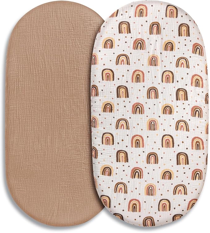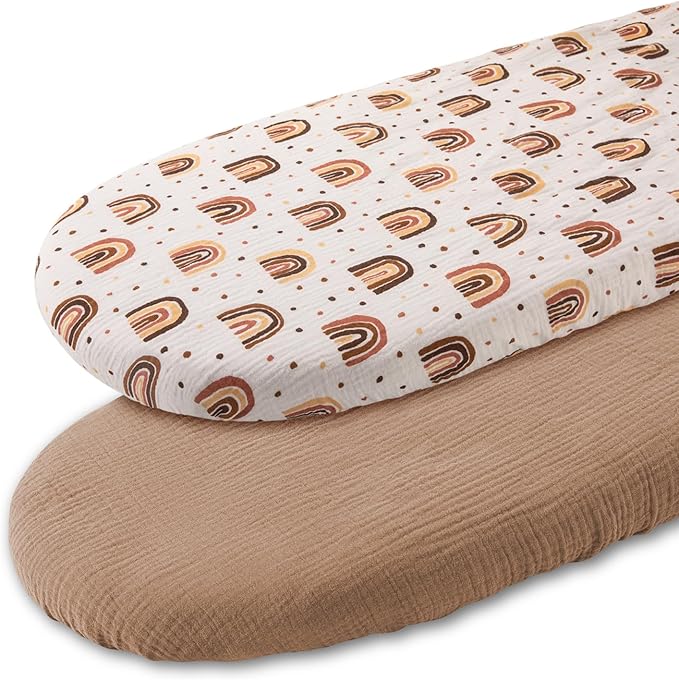 Muslin Bassinet Fitted Sheets, 2 Pack for Baby Boy and Girl, Soft Breathable Stretchy Baby Pad/Mattress Sheet Set, Universal Fit for Hourglass Oval and Rectangle Bassinet Mattress (Cute Rainbow)