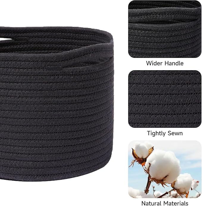 Small Basket for Organizing | Cube Shelf Closet Storage Baskets | 9.7×9.7×7.1” | Woven Rope Gift Basket | Nursery | Round 3 Packs Black