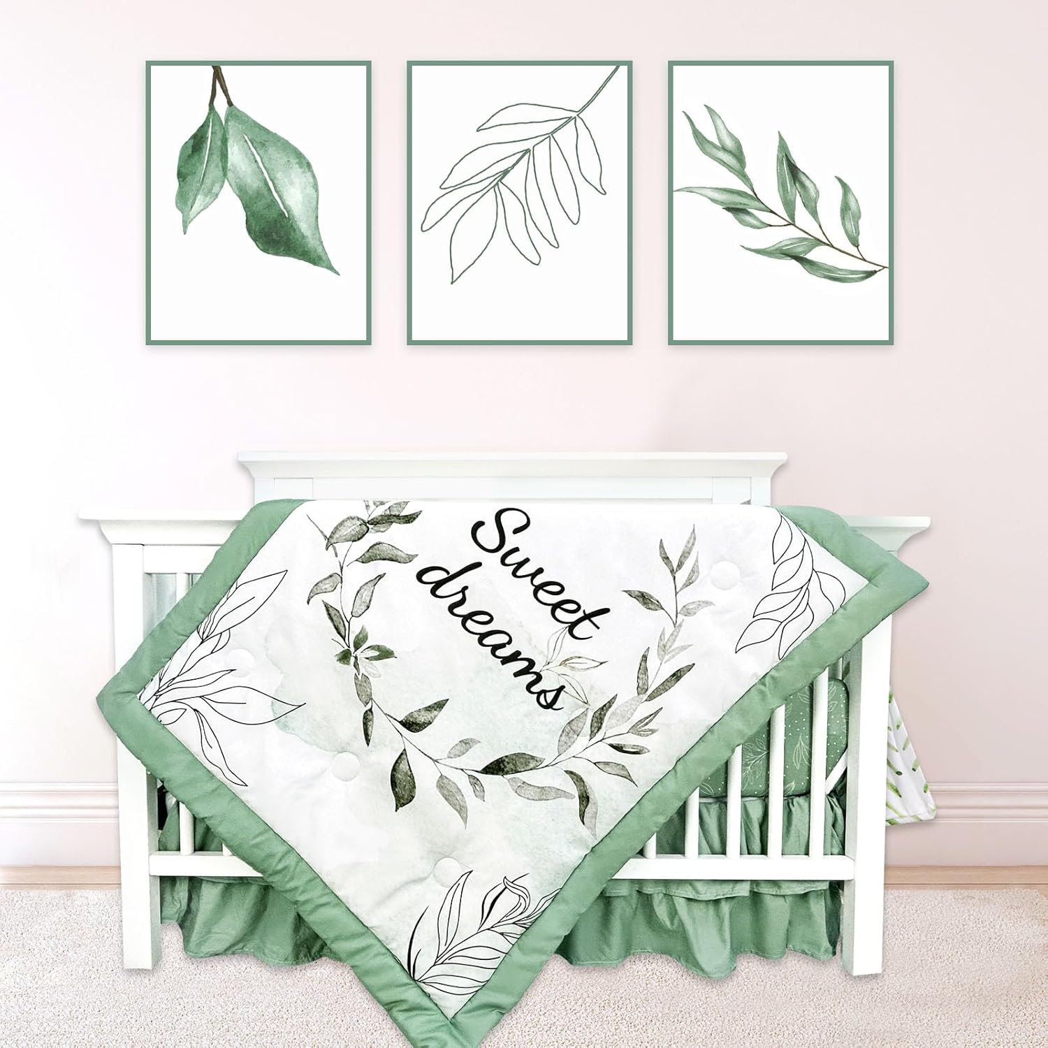 Green Leaf Crib Bedding Set, 4-Piece Baby Boy Bedding Set, Neutral Nursery Bedding Set, Fitted Crib Sheet, Crib Skirt, Baby Quilt, and Diaper Stacker, Sage