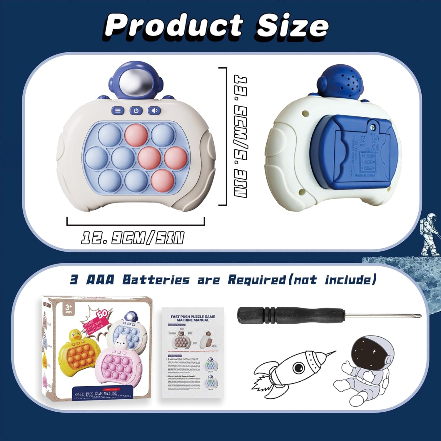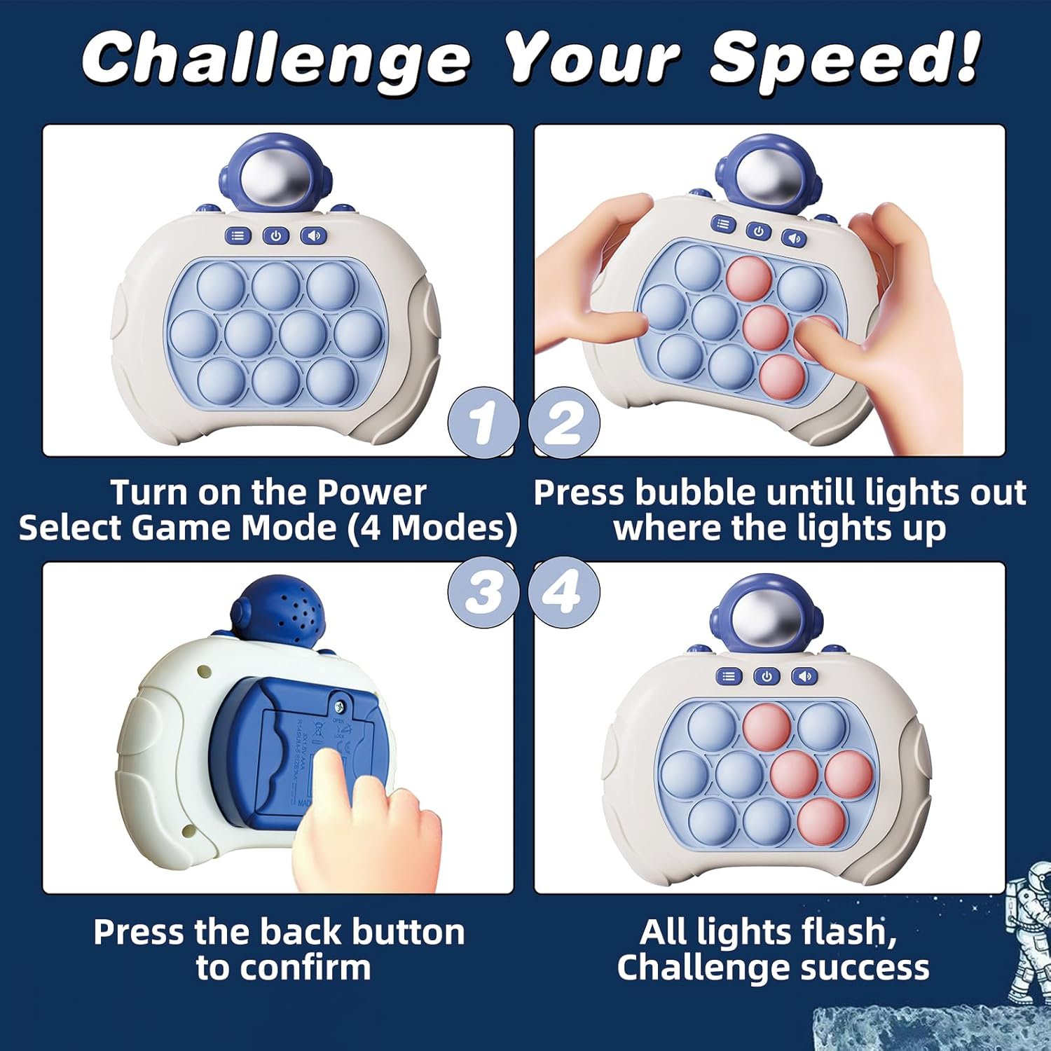 Quick Push Bubble Game Machine, Pop Game Puzzle Educational Console, Light Up Handheld Squeeze ADHD Stress Relief Fidget Toys for 3+ Boys Girls Kids Adults Birthday Christmas 4 Modes, Astronaut