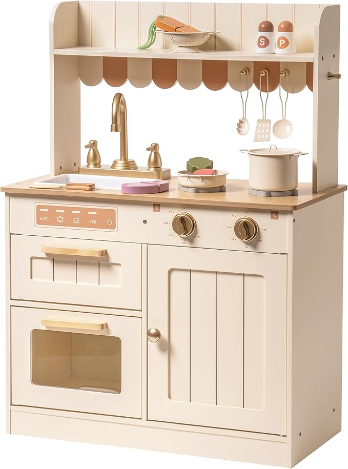 - Stylish Aesthetics: Our play kitchen's soft beige color and gleaming gold faucet create an elegant and modern design that complements any playroom or nursery.