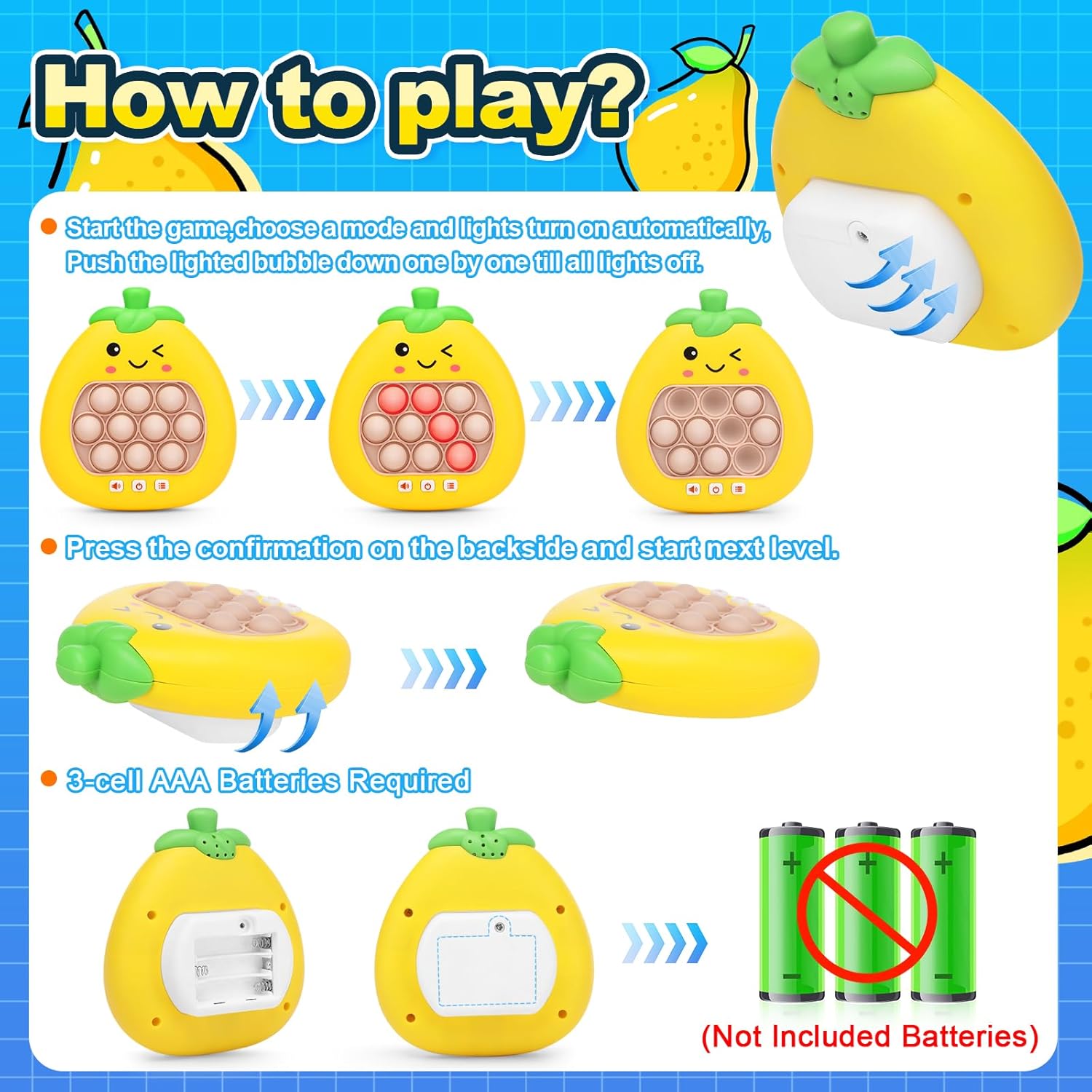 - 【SAFER AND HEALTHIER】: Upgrade Pears pop fidget console game pro toys,QUALITY IS OUR GOLDEN RULE! We use PREMIUM material. The push pop bubble stress reliever toys made of Environmentally Soft Material, Safe and Nontoxic, No Irritating Smell, Durability,so you can play with it anywhere, for REPEATED USE. Portable Size, Easy to Carry. (Requires 3*AAA batteries, not included)Which is healthier and more skin-friendly, so your family or friends can use it with confidence.