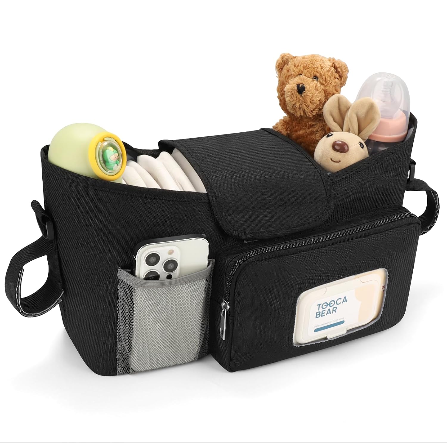 - Multi Structure: This stroller storage organizer equipped with multifunctional structure: Insulated cup holders on both sides to place baby bottles and drink cups; The middle large compartment can accommodate baby diapers, wipes, pacifiers, teething toys and other accessories; Equipped with a convenient wipe pocket for easy access of wet wipes; Mesh phone pocket keep your phone within reach; Secure back pocket for wallet or other important items.