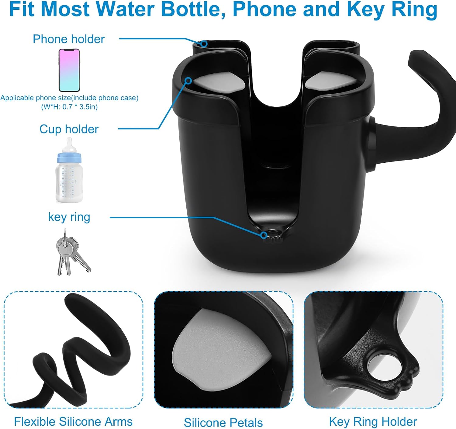 - This 3-in-1 stroller cup holder with a phone holder and keys holder, it can load drink bottles, cell phone and your keys at the same time. Compatible with phones up to 6.8 inches in the market.