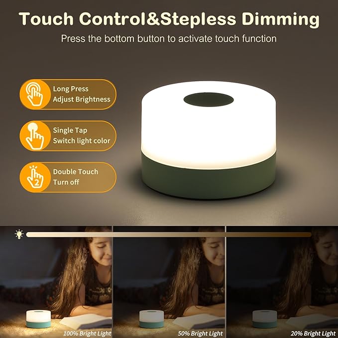 - Easy Touch Control Night Light For Kids: This small bedside lamp features a touch area for convenient use. Slightly tap the top button to power ON. Long press for seconds to adjust the light from brightest to dimmest. Gently touch the button for the 3CCT function, switching the light color from dynamic cool light, and moderate natural light to cozy warm light.