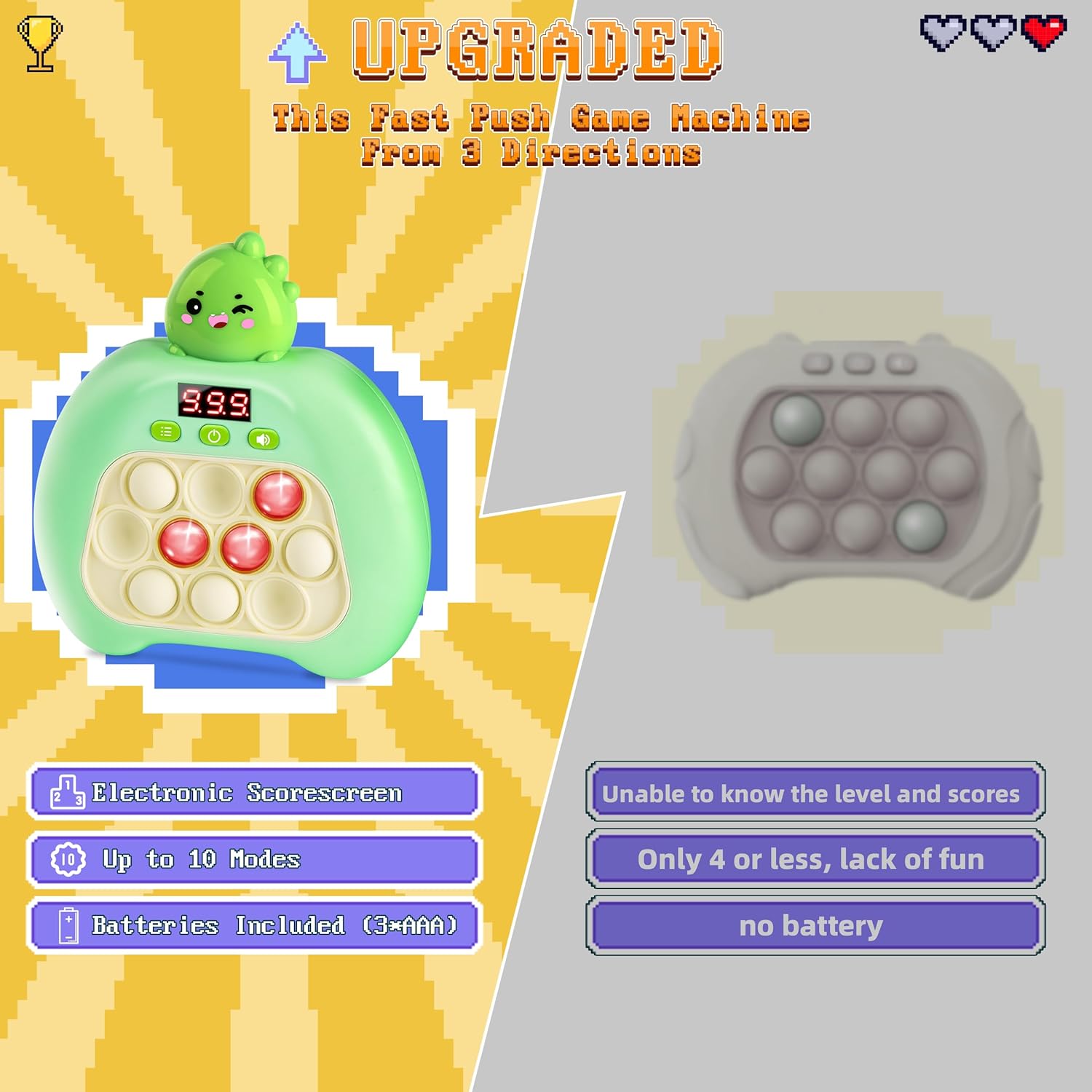 - LED Level Screen & Up to 10 Game Modes: This 2024 latest quick push game comes with 10 game modes, 3*batteries, an LED Screen that lets you know how many levels passed, an exquisite gift box & 999 level setting making it the perfect for players of all ages; It is a pop game machine that exercises reaction ability and improves concentration by pushing quickly to break through levels with lights & music, promoting players' sensory development