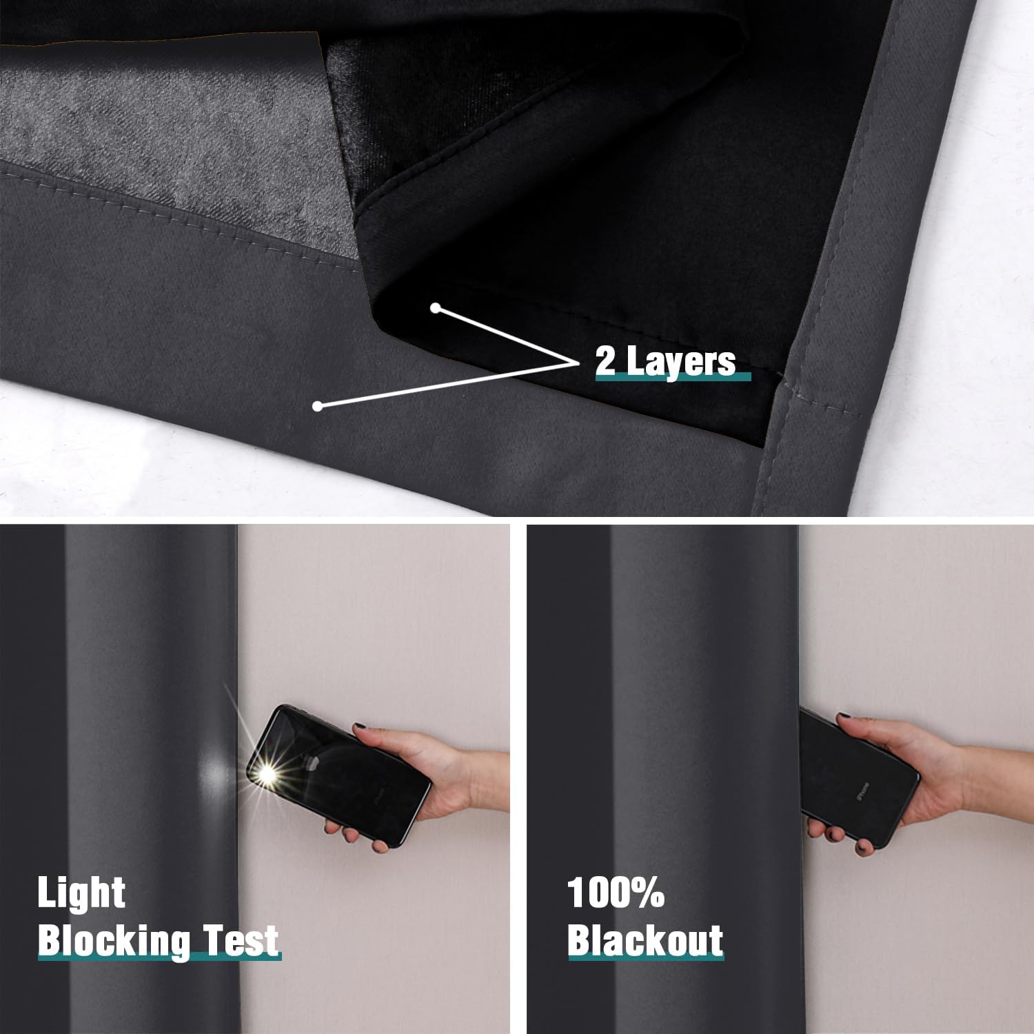 - SET DETAILS: Set of 2 charcoal gray total blackout curtain panels per package. Each lined curtain measures 52 inch wide by 84 inch long with 8 silver metal grommets (1.6 inch inner diameter) on top, easy to install and slide.