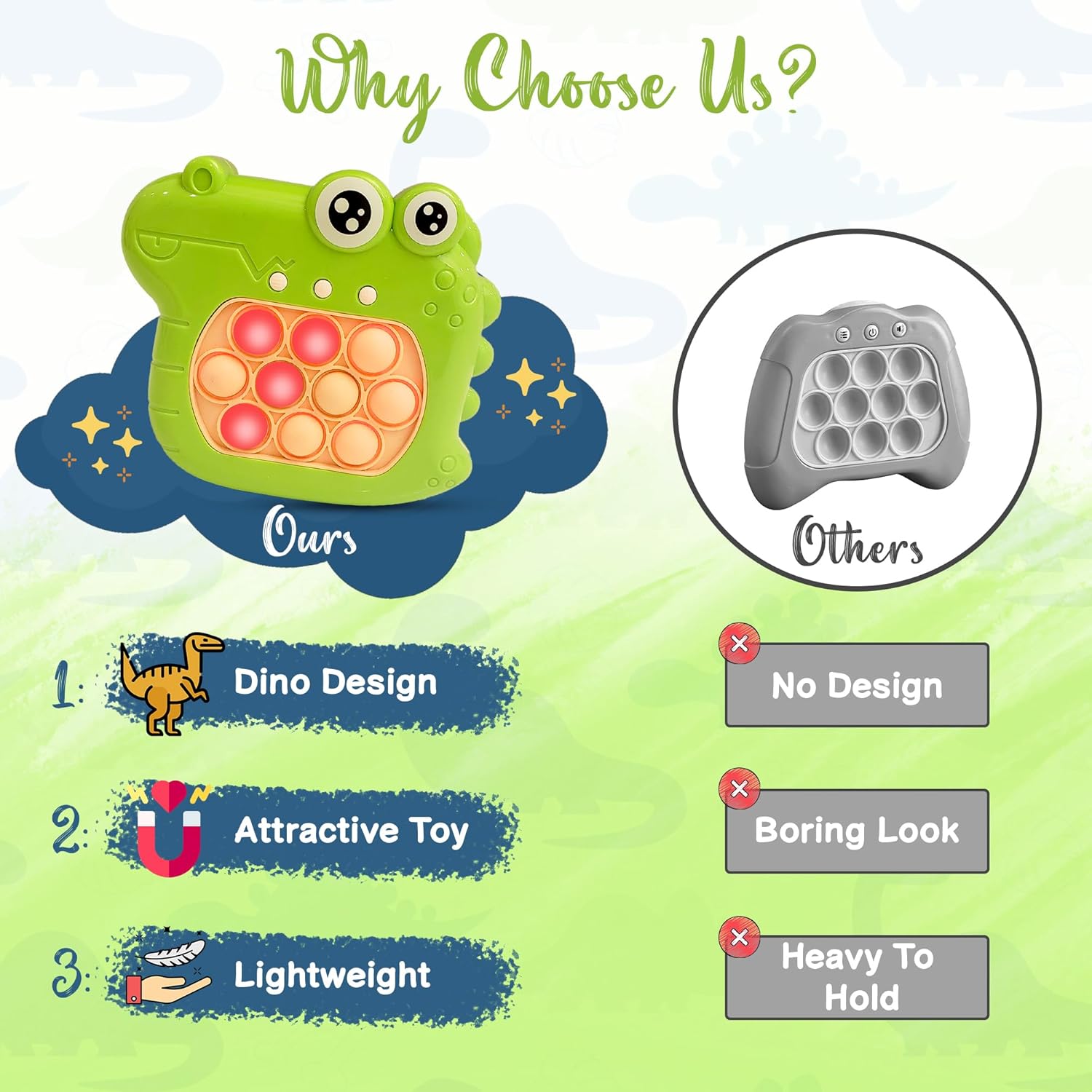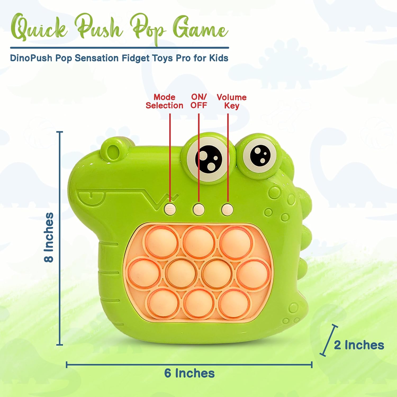 - UNLY U DinoPush Pop Sensation Toy: Immerse in a world of quick reactions and cognitive skill enhancement with our DinoPush Pop. This captivating handheld toy not only promotes coordination but sparks creativity in kids. Unleash the joy of exploration through its 4 dynamic game modes, while the portable design ensures convenience on the go. Crafted with precision, it offers comfort and durability, making it the perfect companion for endless imaginative play.