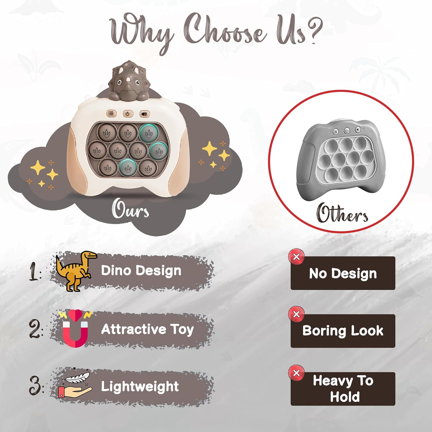 - UNLY U DinoPush Pop Sensation Toy: Immerse in a world of quick reactions and cognitive skill enhancement with our DinoPush Pop. This captivating handheld toy not only promotes coordination but sparks creativity in kids. Unleash the joy of exploration through its 4 dynamic game modes, while the portable design ensures convenience on the go. Crafted with precision, it offers comfort and durability, making it the perfect companion for endless imaginative play.