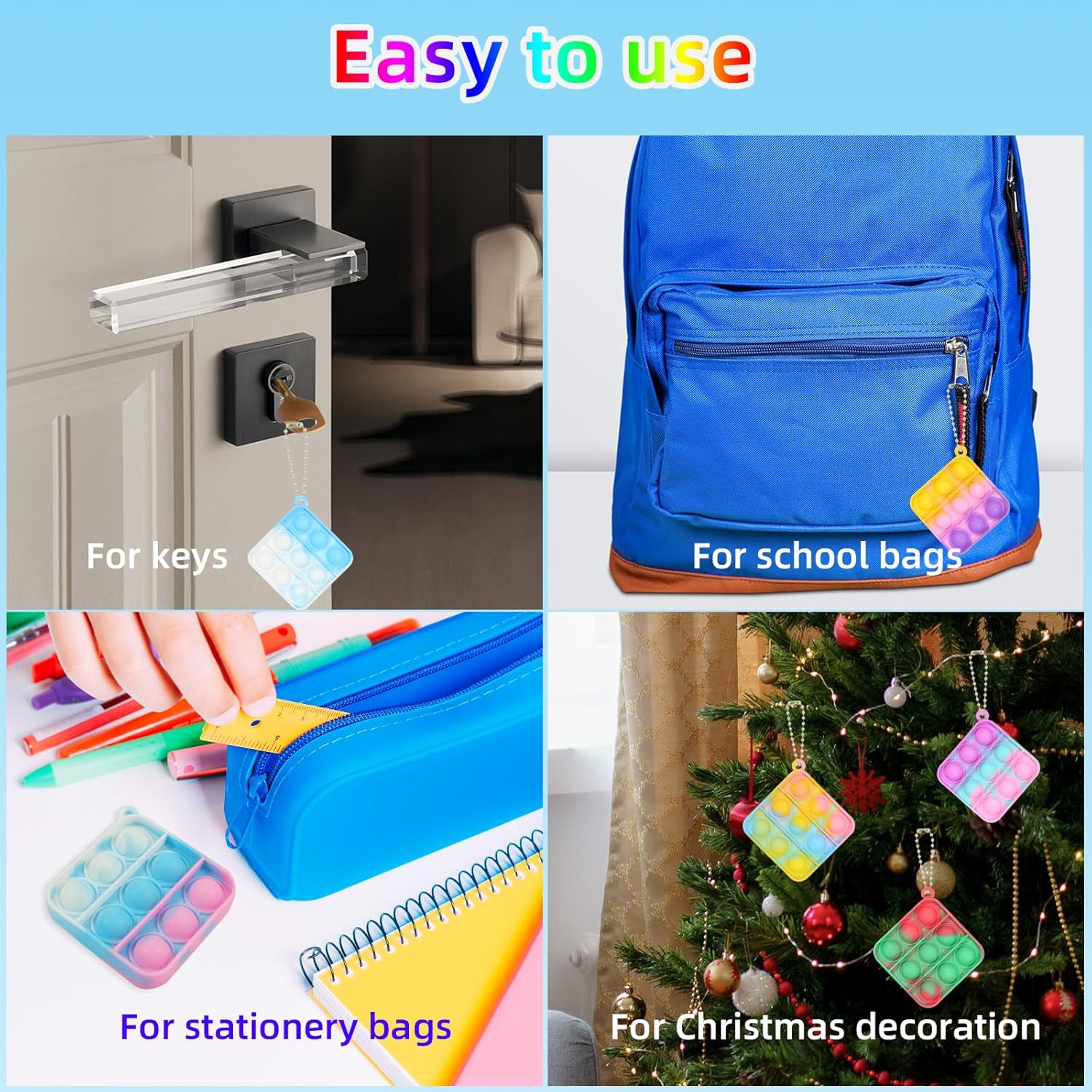 - 【PARTY FAVORS FOR KIDS】 The package includes 60 mini pop Keychains, paired with 60 chains. These mini toys measure about 2 inches.The high quality fidget toys come in beautiful colors.Not only is it soft to the touch and quick to rebound,but it is also very easy to clean.When it is dirty you only needs to be washed with soapy water.You just need to press the bubble with your finger to make a sound.No child can resist these cute mini pop keychains.