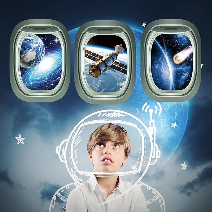 - 【Glow in the Dark Stars】A set of 3 pcs robmoda glow in the dark window shape outer space stickers. Each pc size is 8.26x11.4 inchs, scenes include Earth Nebula, spacecraft, meteorite planets.