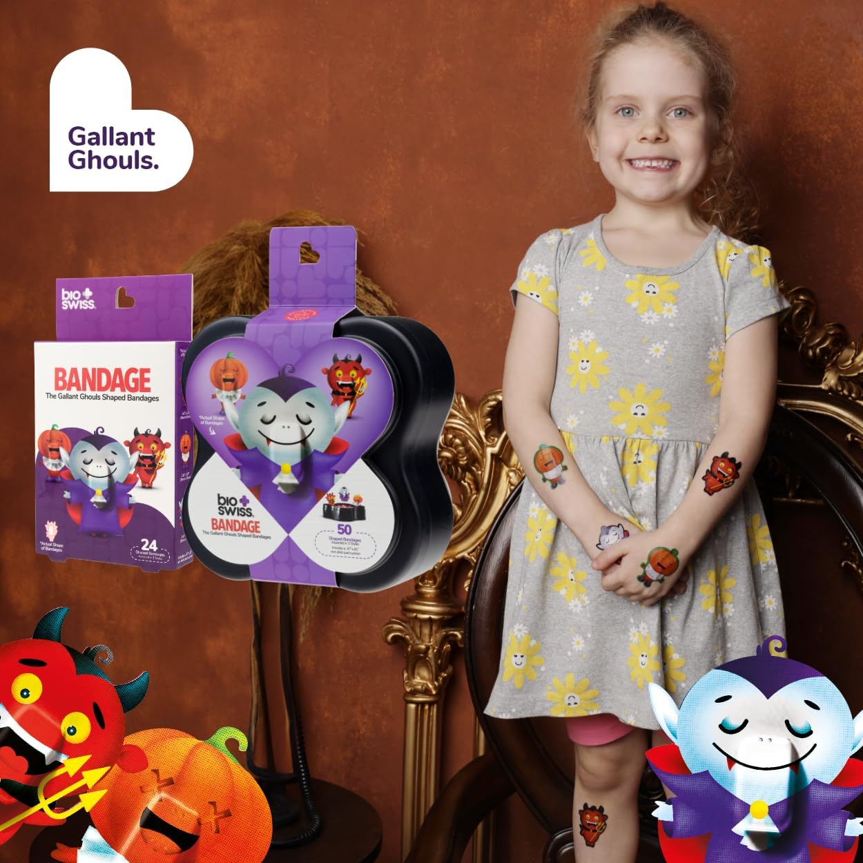 - GHOUL HALLOWEEN BANDAGES: This 24 piece pack of frightfully fun and hauntingly delightful Halloween Ghoul bandages features Felix the Devil, Draco the Pumpkin, and Darthula the Vampire shapes, and is great for putting a smile on kids' faces while protecting wounds such as cuts, scrapes, and burns; sticky bandages come in a cute cardboard box and are perfect for kids and adults alike, and also for school nurses and pediatric doctors