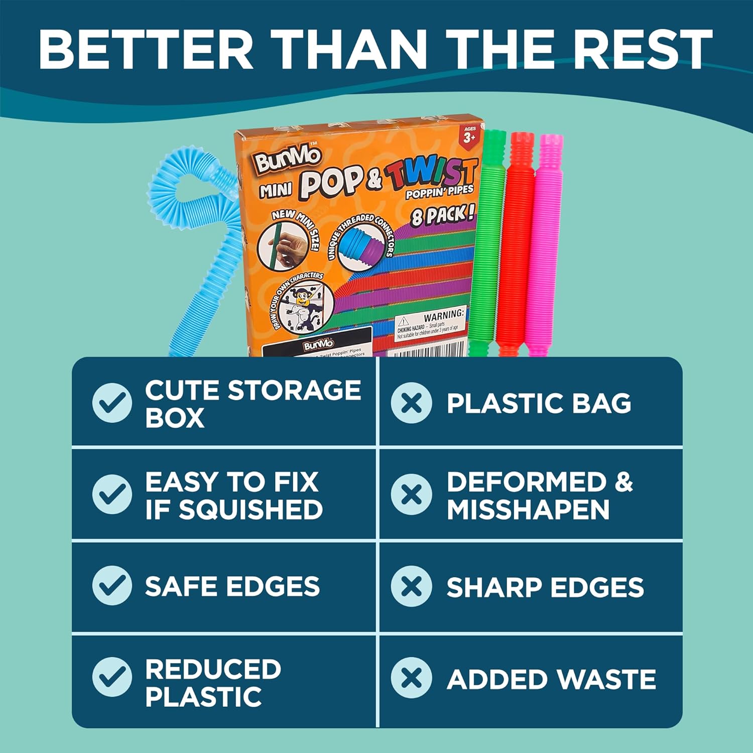 - Limitless Creativity - With BunMo's Mini Pop Tubes, your child can stretch, connect, and create anything they can imagine! These super sensory toys for kids provide hours of entertainment and endless possibilities for imaginative play.