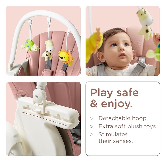 - Childhood Joy: comes with a free high chair toys arch, the position and angle of the toys arch can be adjusted at will, and individual toys can be easily disassembled. so your little one will never get bored, this perfect baby high chair is cute and fun for bebe. (Please note: Due to manufacturing updates, toys on the toy arch may vary between detachable or fixed designs by batch. )