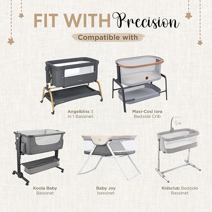 - FITS MOST BASSINETS & BEDSIDE SLEEPERS: Fitted sheets specially designed for a universal fit on most shapes of baby bassinet mattress (oval, rectangle, hourglass) as well as specific bedside sleeper brands like Maxi COSI Iora, Koola Baby, Angelbliss & Kidsclub and more.