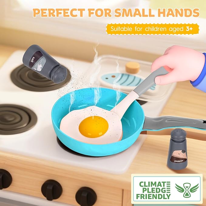 - 【Realistic Kitchen Playset & Cuttable Food】Realistic cooking set encourages imagination, dexterity, and creative play, Teaches your little ones to be mother's little helper. The kettle can be filled with water and the spout can be pulled out. you can peel the banana, fillet the fish and take the peas out of the pod. Give our product as a gift to your child and they loves to make “food” and cook for you in their kitchen