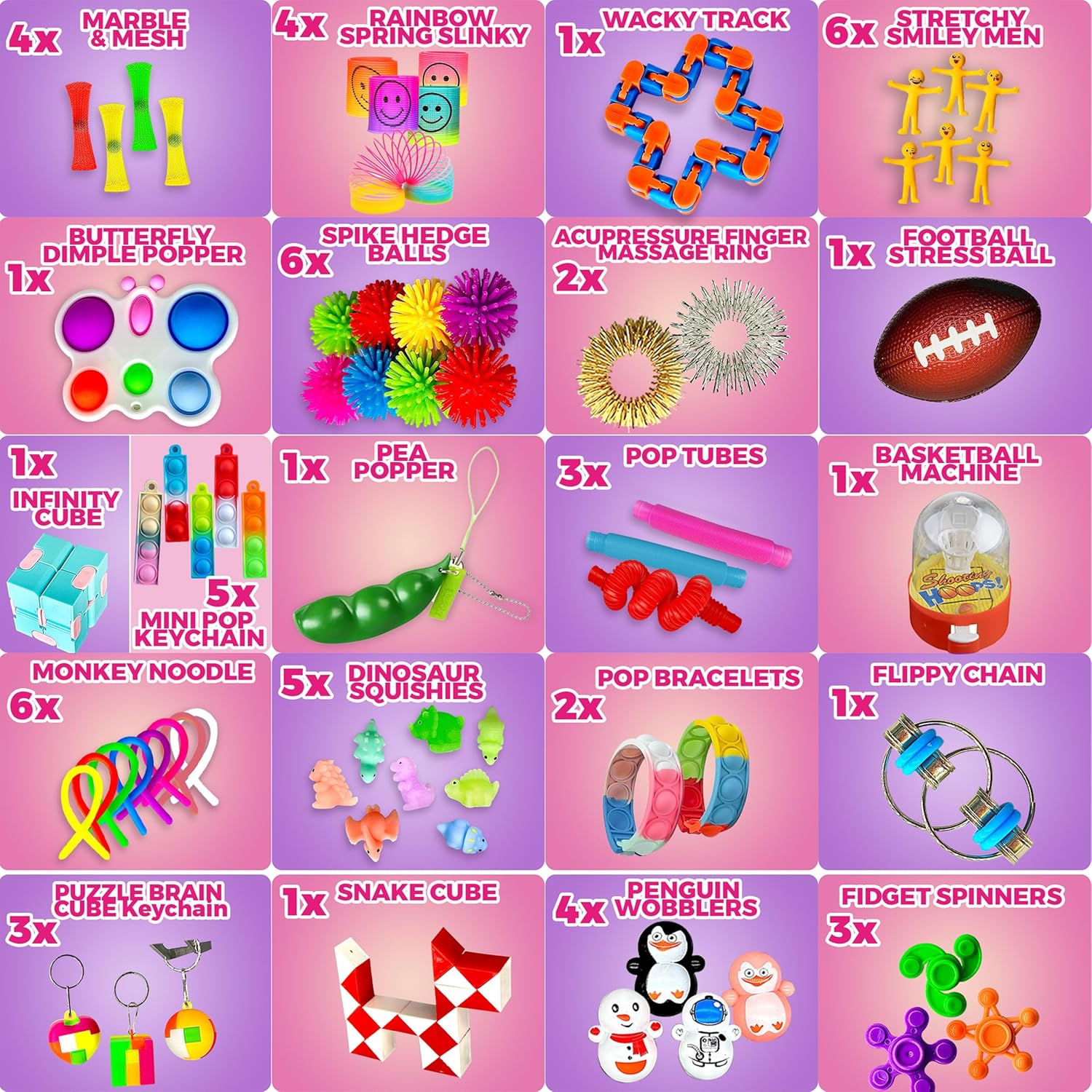 - 【SET OF 120】4 Poppers, 2 Squishy Balls, 2 Stress Balls, 4 Sticky Hands, 4 Spinners, 1 Infinity Cube, 2 Sensory Rings, 1 Flippy Chain, 5 Dino Squishies, 2 Pop Bracelets, 10 Slimes, 1 Snake Cube, 6 Monkey Noodles, 1 Unicorn Pop Purse, 1 Dimple, 1 Pea Popper, 4 Springs, 1 Wacky Track, 3 Puzzle Cubes, 6 Stretchies, 6 Spike Balls, 4 Marble&Meshs, 1 Rubik, 1 Maze Puzzle, 1 Basketball Machine, 4 Penguin Wobblers, 3 Pop Tubes, 8 Pop Rings, 1 Controller Pad, 5 Keychains, 25 Building Blocks