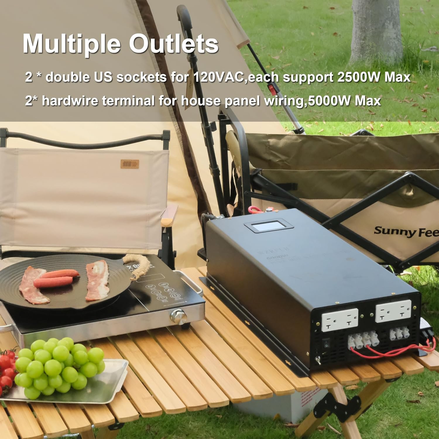 - FEATURES: 2pcs dual 120V outlets with max 2500W each, 1*240VAC hardwire terminal(3-wire) with 5000W max (L+N=240V) and a hardwire terminal(4-wire) with Multi-mode (L1+L2=240V, L1+N=120V, L2+N=120V ),support 120VAC and 240VAC output at the same time,up to 91.6% efficiency