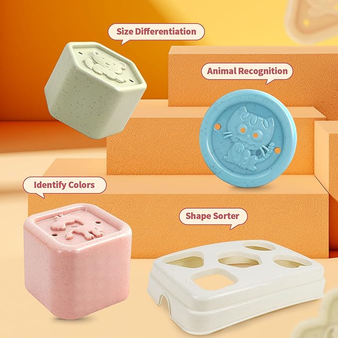 Shape Sorters Baby Toys 5 in 1 Montessori Toy for 6-48 Months Stacking Cups,Rings Toy Links,Soft Stacking Rings,Blocks Set,Soft Animals Toys Shape Sorters for Toddlers 1-3