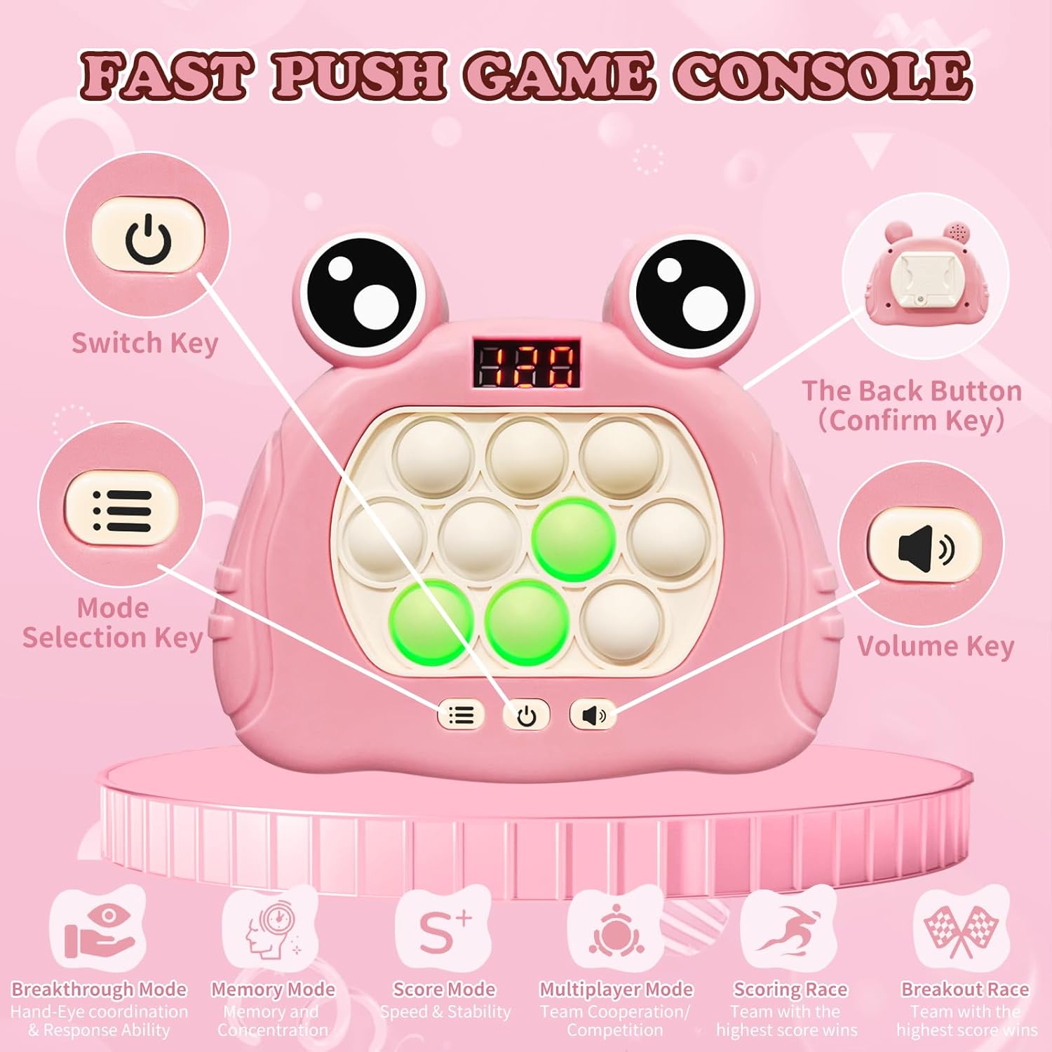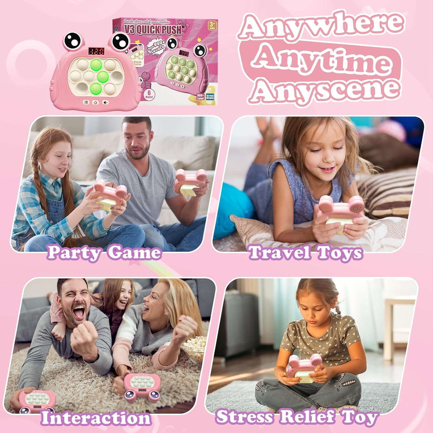 - 🎀【Interactive Handheld Pop Console Game】-- Quick push game, perfect for releasing kids stresses and enhancing sensory stimulation. Meanwhile, it attracts kids and adults playing for hours away from their phones and computers, effectively reducing screen time, protect their eyes. The novel game mode can also help you concentrate, beat boredom and relieve study, work and office pressure, generate happiness. The design makes it a great STEM toy for improving focus and engagement.