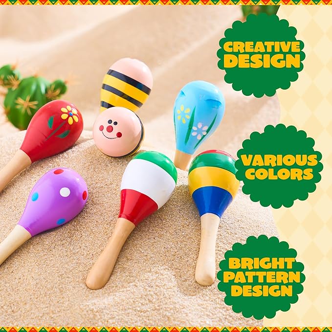 - MARACAS FOR KIDS: Elevate the fiesta with 24 vibrant maracas and child-friendly Mini Wooden Maracas, perfect for little hands to shake and enjoy the rhythm of the celebration.