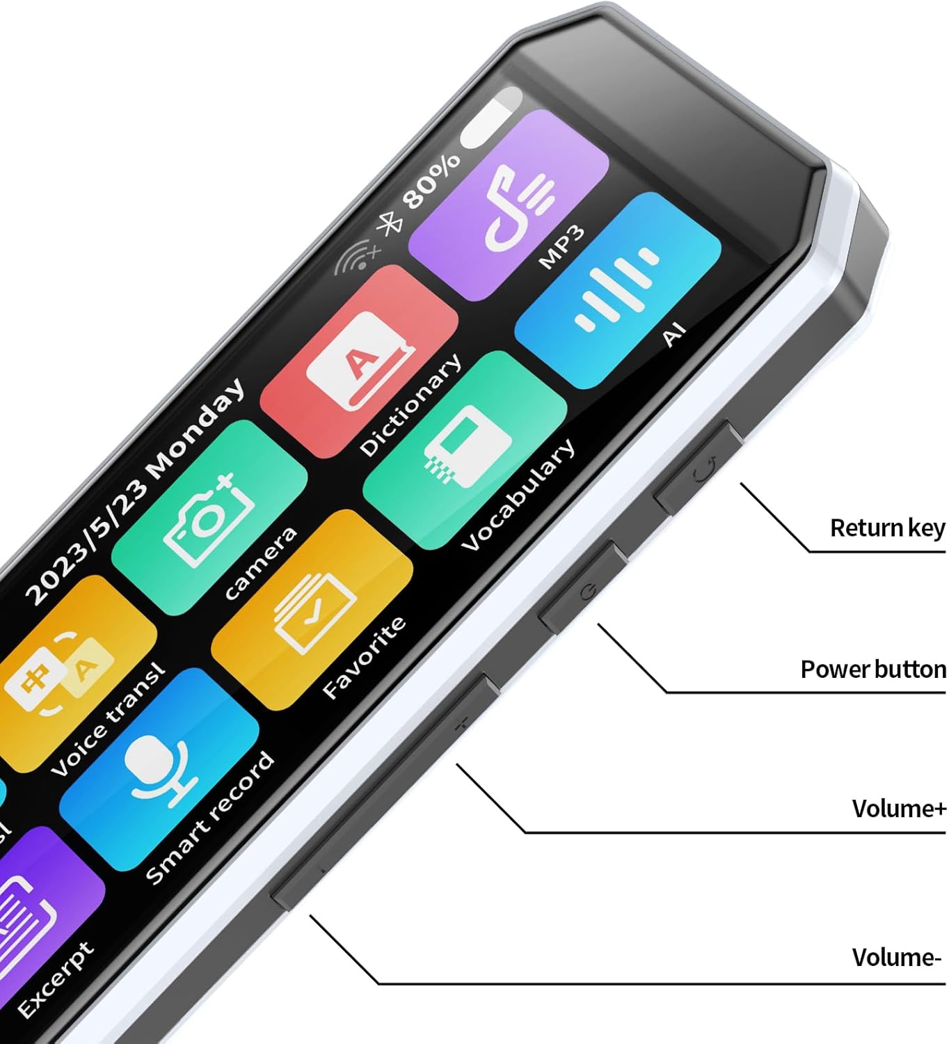 - 21 Functions: The multifunctional translation pen has 21 functions. Including Scanning Translation, Voice Translation, Photo Translation, Dictionary, Text Excerpt, Smart Recording, Favorites, Vocabulary, AI Voice, Pinyin Scan, MP4, Pinyin Learning, Ancient Poems, Alphabet Learning, Phonetic Learning, Word recitation, Math Learning, Camera, Album, Local Music, and Settings. Great for reading and learning.