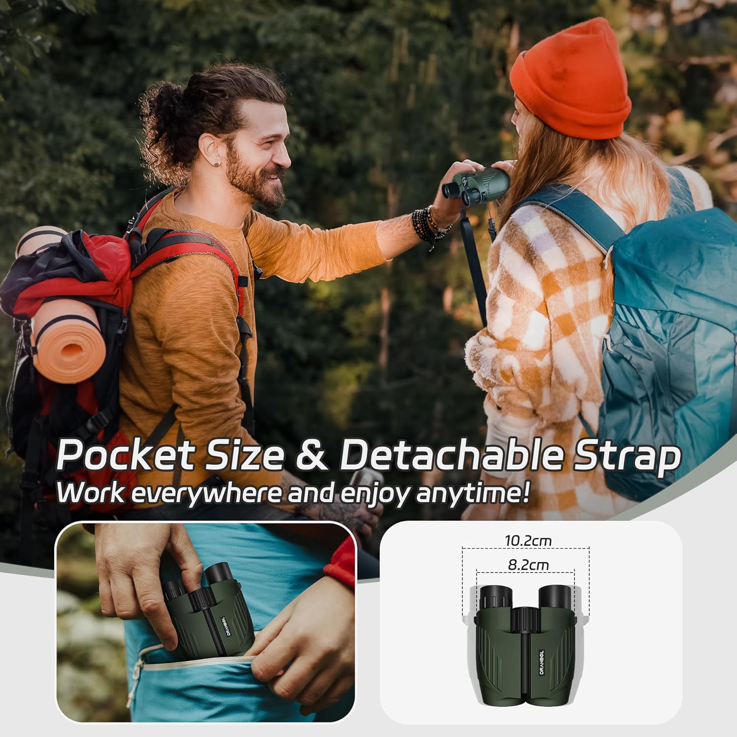 - [Ergonomic Design]Designed with ergonomics in mind, the compact binoculars has a size that fits comfortably in your hand. It features a rubber anti-slip strip on the front for shock absorption and slip resistance, while the back has a groove for your thumb to grip easily. It comes with a storage bag that can be attached to a belt and a wider and stronger neck strap, reducing the burden when wearing, and there is no need to worry about the strap breaking easily.