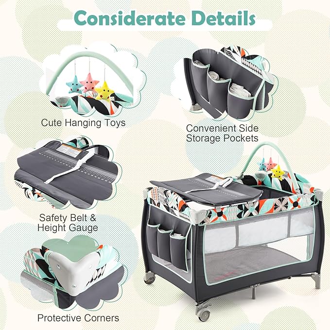 - 【Child-friendly Thoughtful Details】: The portable crib playard is designed with thoughtful details to enhance functionality and convenience. It features 3 side storage pockets to keep baby's essentials organized, a comfortable mattress for baby to sleep soundly, and a detachable toy bar with 3 cute hanging toys to keep your baby entertained.