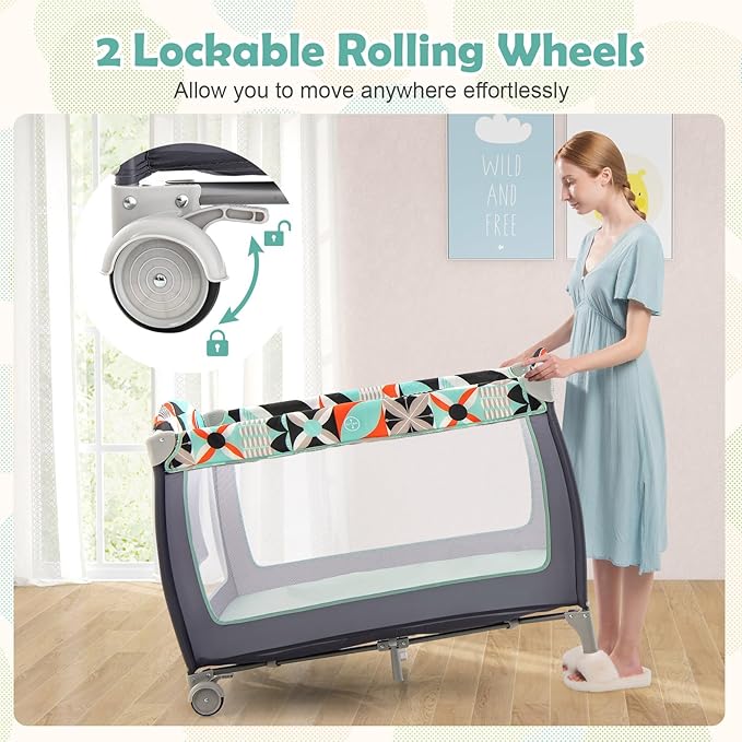 - 【Quick Setup & Easy Mobility】: To set up the baby playard, you just need 4 easy steps! ①take out the bed; ②open the long bed rails; ③open the short bed rails; ④press the bottom center down. In addition, it is designed with 2 lockable rolling wheels that make it effortless to move from room to room.