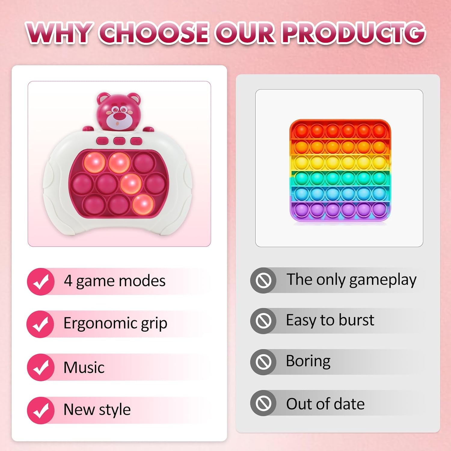 - 🎁【Easy To Play】Pop all the lit bubbles as soon as they appear, and then press the big button on the back to reset the bubbles before time runs out! Keep popping the bubbles fast to level up. It is a perfect gift for boys and girls to developing fine motor skills, cognitive abilities, and sensory processing skills, making it an ideal educational toy for kids.