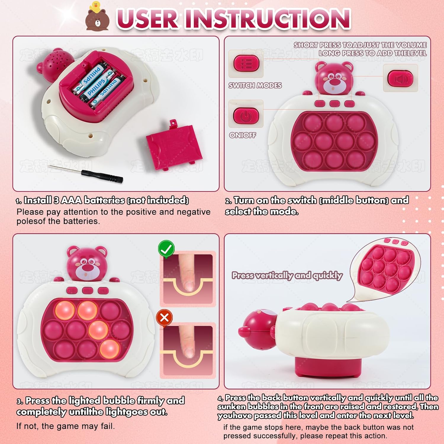 - 🎁 【Versatile Pop Fidget Game Machine】Get ready for endless hours of fun with our versatile pop fidget toy! With four exciting game modes, including single-player challenges and multiplayer showdowns, this handheld toy is perfect for players of all ages. Simply install three AAA batteries and adjust the volume to your liking, then let the games begin!