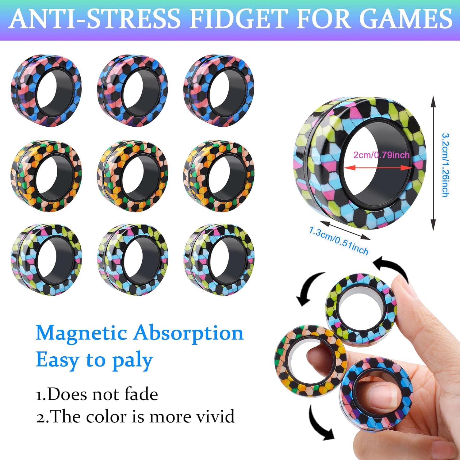 - ANTI-STRESS MAGNETIC SPIN RINGS: Magnetic fidget toys to relieve anxiety, stress, focus. Magnetic finger fidget toys are ideal for Autism, ADHD, or anyone with busy fingers. Plus, magnetic rings toy can help curb unwanted habits like nail biting, smoking