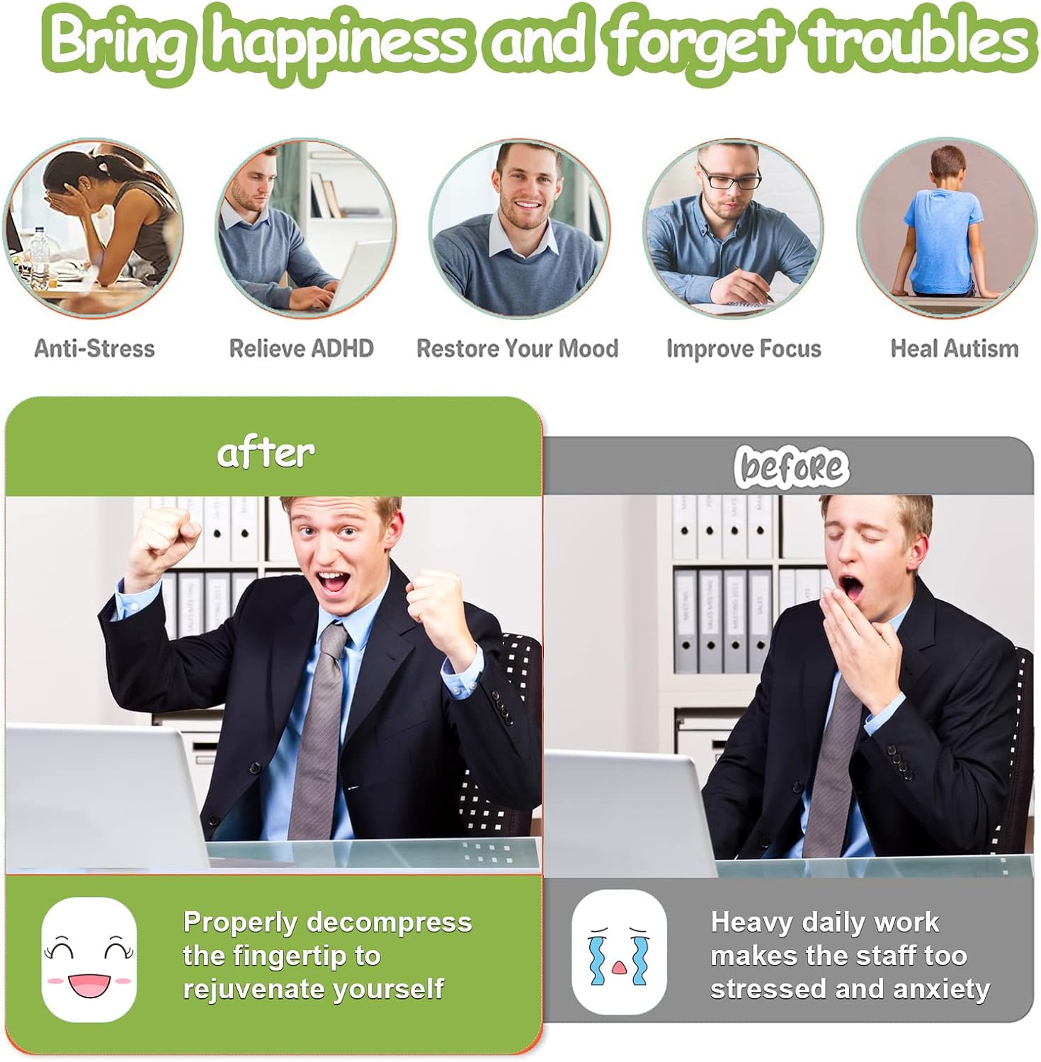 - Bright Colors :Different colors will give people a different mood, a good color collocation can create a positive office environment, bright color desk fidget toys let you bid farewell to the dull atmosphere and visual pressure, improve your work efficiency.