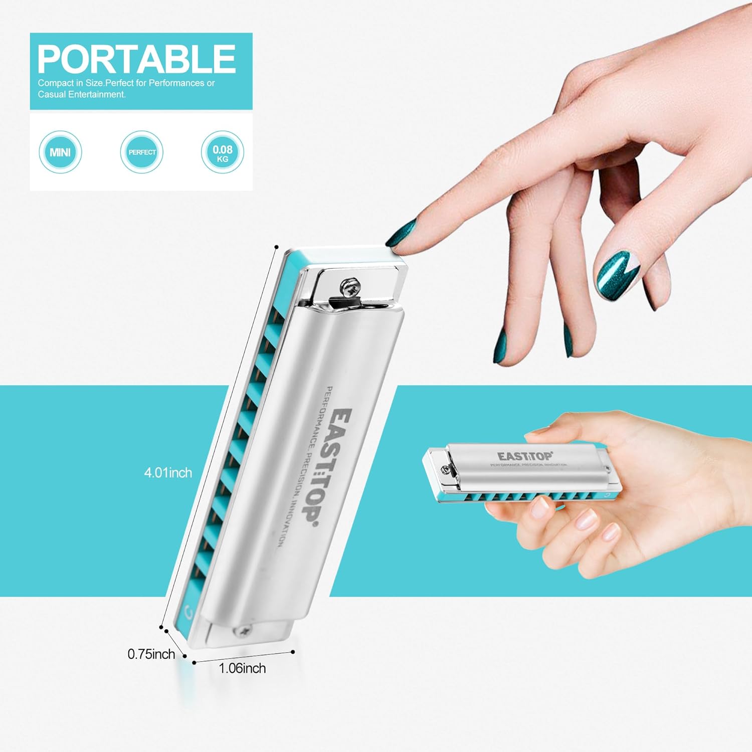 - Package includes 1x harmonica (key of F#); 1x instruction and 1x cleaning cloth. This harmonica is an upgraded version of the T008K, which uses a more complex spot welding technique in the gong soldering process. Therefore, this harmonica can play more beautiful songs.We are the harmonica manufacturer of the East top brand. Backed Up with East top 30 Days Unconditional Money Back. You can rest assured to buy our products.