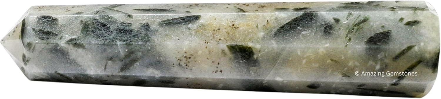 - Green Tourmaline in Quartz Crystal wand configuration enhances the metaphysical and healing properties of the source crystal. A crystal point is a powerful crystal tool. When placed facing away, the crystal point directs energy outward.