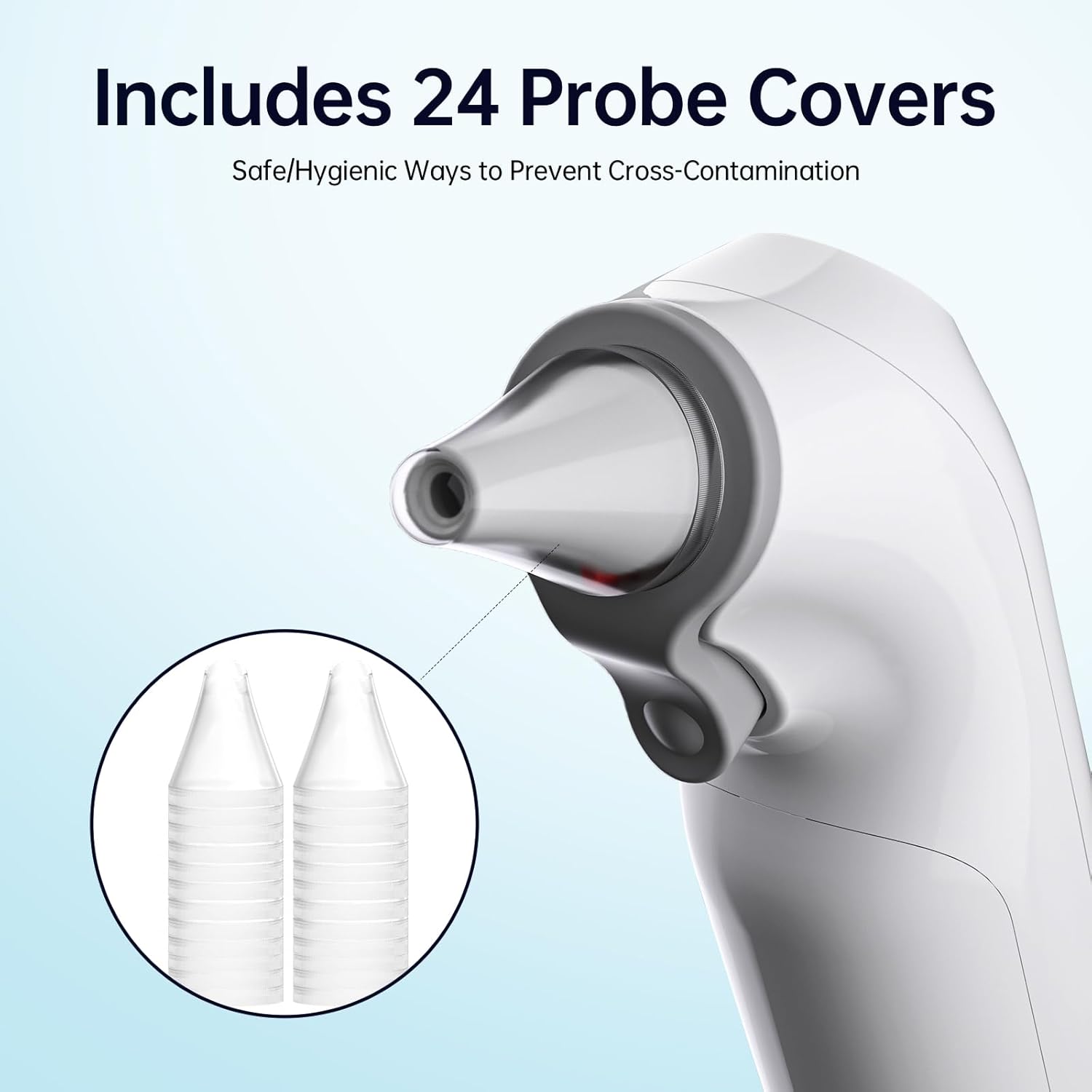 - NON CONTACT AND MORE HYGIENIC : No contact with the probe during temperature measurement, built-in 24 replaceable disposable ear cushions, replace the ear cushions before each temperature measurement to prevent mutual infection among family members